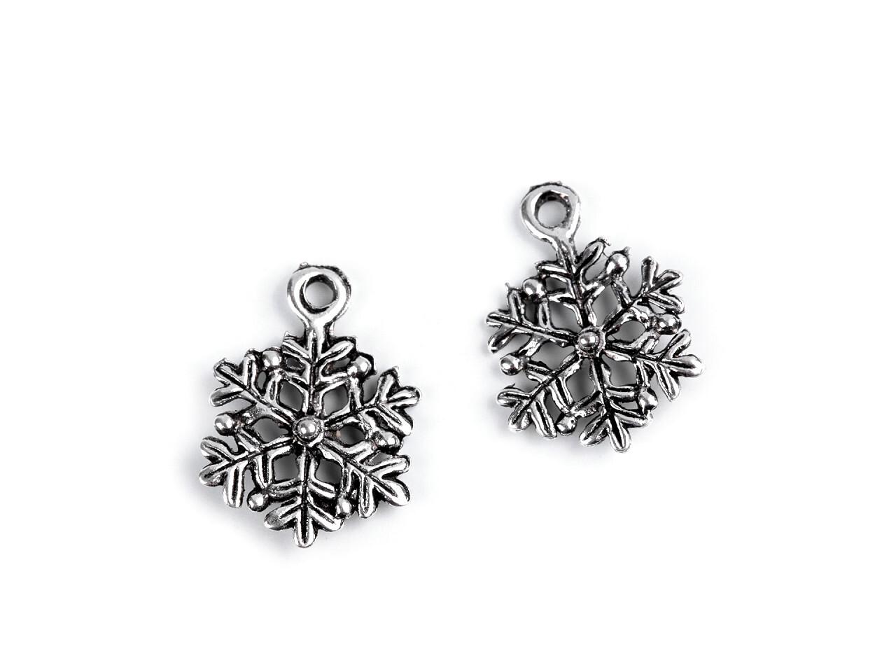Malý kovový přívěsek ve tvaru sněhové vločky je plochý, oboustranný. číst celé