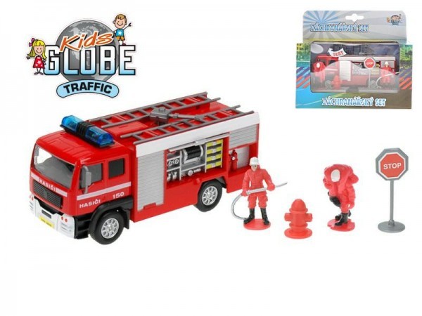 Auto hasiči kov 13cm s postavičkami na zpětný chod na baterie se světlem se zvukem v krabičce