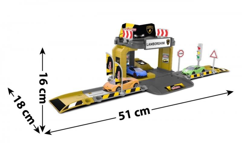 Showroom Lamborghini s horním patrem, kovovým autíčkem, silnicemi a dopravními značkami. Délka auta 7,5 cm. Herní sety Creatix jsou vzájemně kompatibilní.