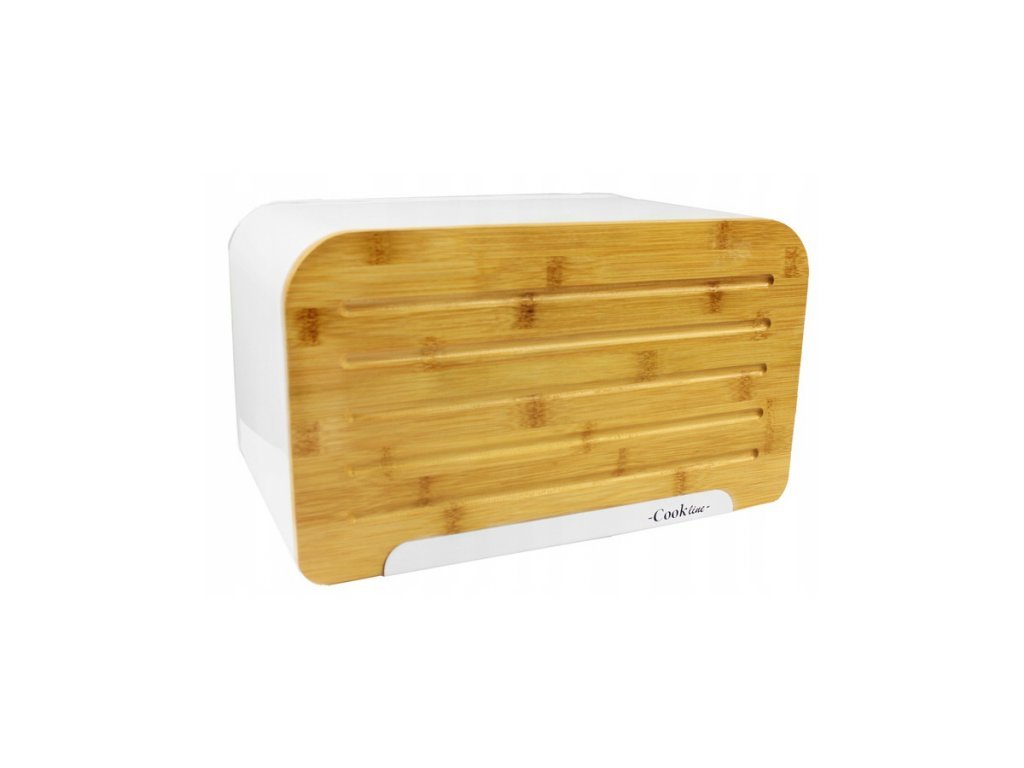 Moderní kuchyňská dóza na uskladnění pečiva s kovovým tělem a bambusovým víkem, které lze současně využít jako prkénko na krájení pečiva.