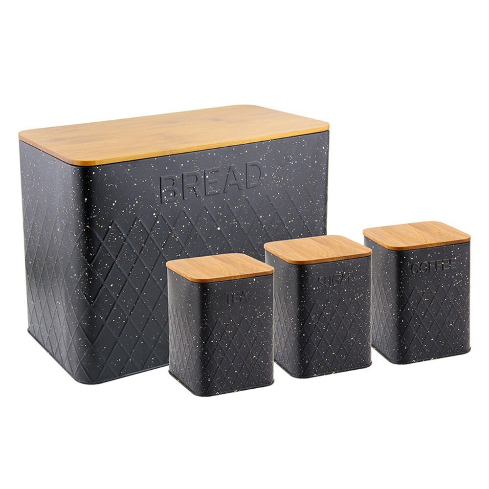 HOME ELEMENTS-HR Chlebník kovový + 3 dózy na potraviny, kov s bamb. dřevem,barva černá