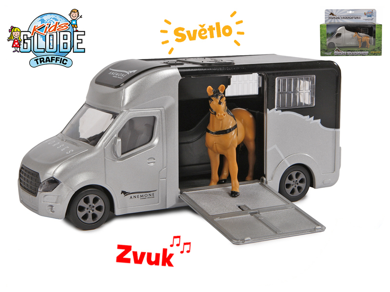 Krásný set pro všechny milovníky koní v podobě auta na přepravu koní a figurky hnědého koníka. Auto měří 20 cm, je na baterie a doplněno světelenými i zvukovými signály. Tento set je součástí kolekce Kids Globe, která obsahuje exkluzivní kovové kousky aut.