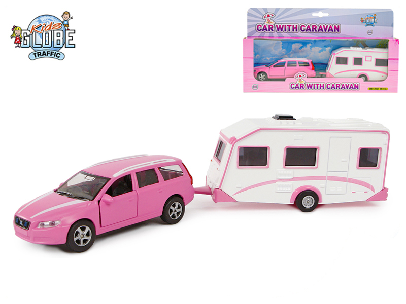 Kovový model autíčka Volvo V70 včetně karavanu o velikosti 30 cm. Auto i karavan jsou zbarveny do růžova. Auto je na zpětný chod. Přední dveře má otevíratelné.