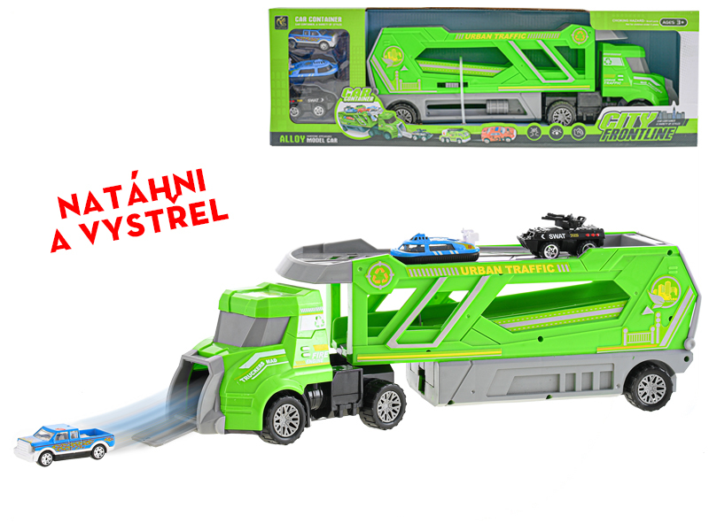 Přepravník aut 41cm na volný chod + 3auta 6cm kov na volný chod v krabičce