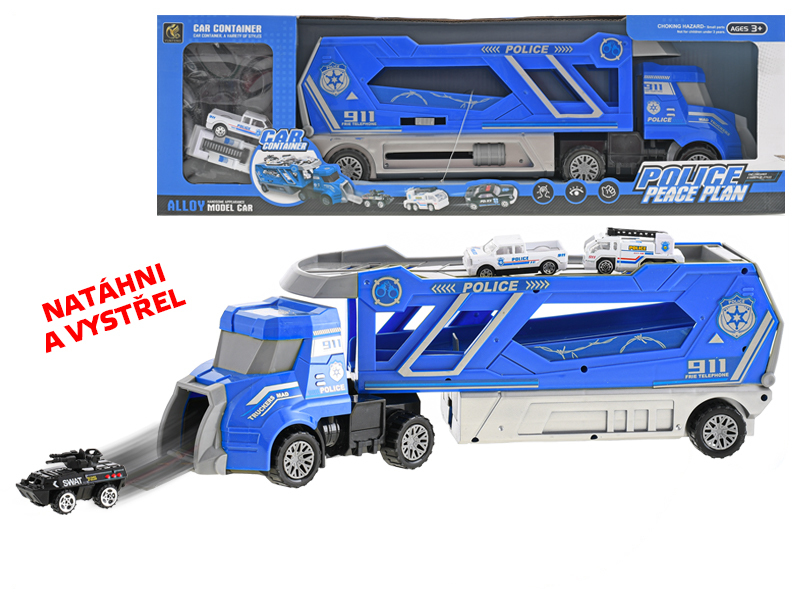 Přepravník aut policie 41cm na volný chod + 3auta 6cm kov na volný chod v krabičce