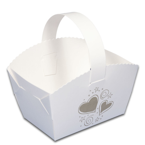 Tento odolný košíček je vyroben z kvalitního bílého kartonu zdobeného milými srdíčky, který se skvěle hodí nejen na svatební koláčky, ale také na drobné chuťovky či různé druhy svatebního pečiva. Je univerzální a využijete ho i při jiných příležitostech, jako jsou firemní večírky, narozeninové oslavy nebo jiné slavnostní události.