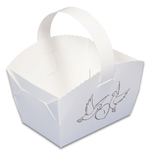 Košíček je vyroben z kvalitního bílého kartonu s decentním potiskem holubiček, symbolů lásky a míru, což ho činí ideálním pro svatby, ale také další slavnostní události jako jsou firemní večírky nebo narozeninové oslavy. Navržený tak, aby odpovídal mezinárodním normám BRC(G)S pro bezpečnost potravin, je vhodný i pro přímý kontakt s mastnými a vlhkými potravinami, čímž zaručuje hygienu a bezpečnost vašich dobrot.