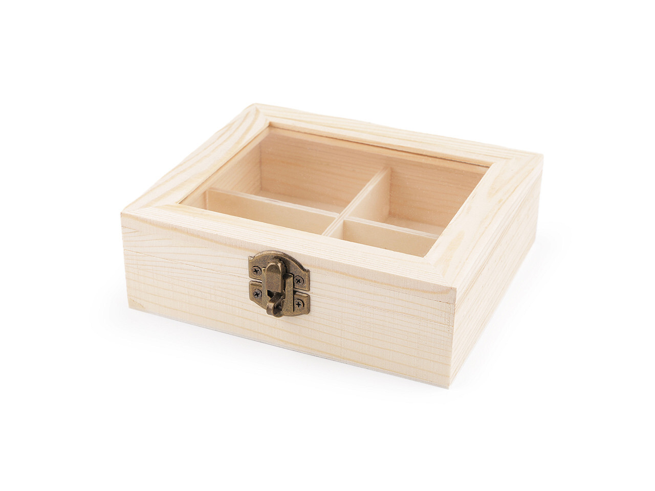 Dřevěná krabička s průhledným skleněným víkem se hodí na uložení drobného kreativního materiálu. Víko je odklápěcí, s kovovým zapínáním a panty. Hodí se na korálky, knoflíky, bižuterní materiál apod. Najde využití i jako stylový organizér v domácnosti, do skříně, šuplíku apod. Vejdou se do ní náramky, gumičky, sponky apod. Je oblíbená i sběrateli drahých kamenů a minerálů.