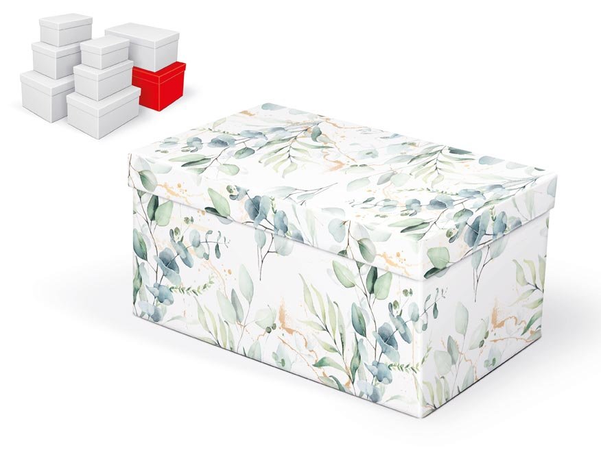Dárková krabice s designem eukalyptových listů. Vhodná ke slavnostním příležitostem, pro zabalení dárků na oslavy, svatby nebo jen tak, k uschování různých drobností. Dodáváme pouze v setu 8 dárkových krabiček, které jsou ve stejném designu, ale v různých velikostech. Při vložení do košíku se automaticky vloží i ostatní krabičky, tak aby jste měli v košíku vždy celý, kompletní set.