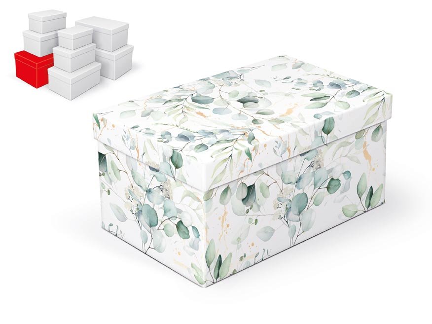 Dárková krabice s designem eukalyptových listů. Vhodná ke slavnostním příležitostem, pro zabalení dárků na oslavy, svatby nebo jen tak, k uschování různých drobností. Dodáváme pouze v setu 8 dárkových krabiček, které jsou ve stejném designu, ale v různých velikostech. Při vložení do košíku se automaticky vloží i ostatní krabičky, tak aby jste měli v košíku vždy celý, kompletní set.