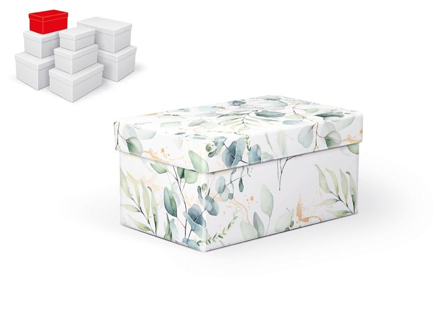 Dárková krabice s designem eukalyptových listů. Vhodná ke slavnostním příležitostem, pro zabalení dárků na oslavy, svatby nebo jen tak, k uschování různých drobností. Dodáváme pouze v setu 8 dárkových krabiček, které jsou ve stejném designu, ale v různých velikostech. Při vložení do košíku se automaticky vloží i ostatní krabičky, tak aby jste měli v košíku vždy celý, kompletní set.