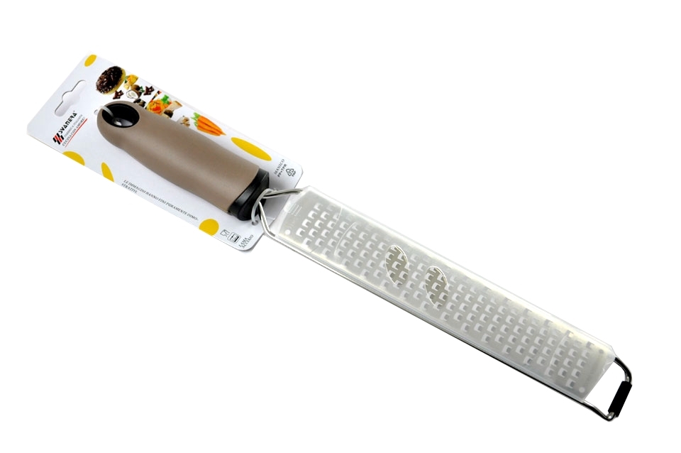 Vysoce kvalitní dlouhé kuchyňské nerezové ploché struhadlo s velkou slzou a ergonomickou plastovou ručkou s protiskluzným povrchem pro pohodlné držení při práci.