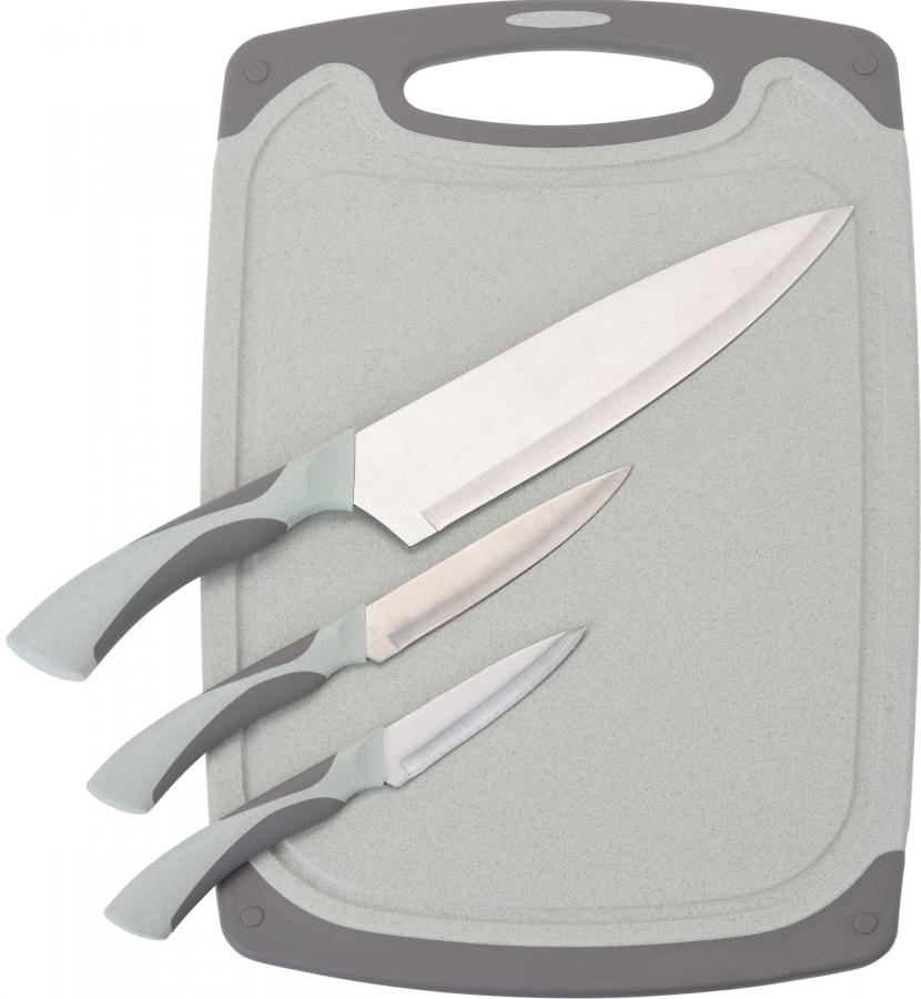 Sada prkénko + 3ks nožů bude mít využití v každé kuchyni. Nože mají ergonomicky tvarovanou rukojeť s nerezovou čepelí. Sada obsahuje prkénko s měkčenými soft okraji proti klouzání a pro příjemný dotek s rozměrem 40 x 24 cm, 1 x kuchařský nůž 34 cm, univerzální nůž 23 cm a loupací nůž 20,5 cm
