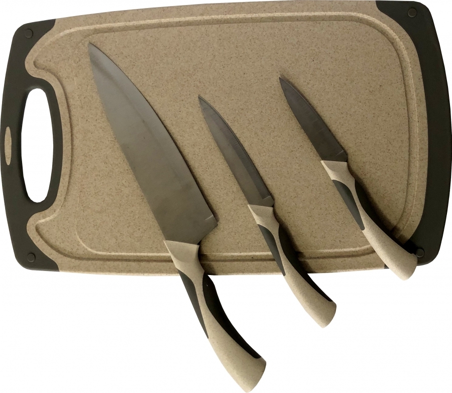 Sada prkénko + 3ks nožů bude mít využití v každé kuchyni. Nože mají ergonomicky tvarovanou rukojeť s nerezovou čepelí. Sada obsahuje prkénko s měkčenými soft okraji proti klouzání a pro příjemný dotek s rozměrem 40 x 24 cm, 1 x kuchařský nůž 34 cm, univerzální nůž 23 cm a loupací nůž 20,5 cm