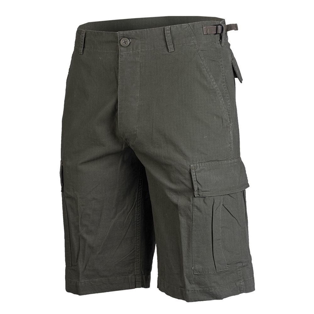 Lehké kraťasy z materiálu rip-stop. Zapínání na knoflíky. 2 boční kapsy. 2 kapsy na stehnech s knoflíky kryté klopou. 2 zadní kapsy. Nastavitelný pas pomocí stahovacích pásku na bocích. Předepraný materiál. Materiál: 100% bavlna. číst celé