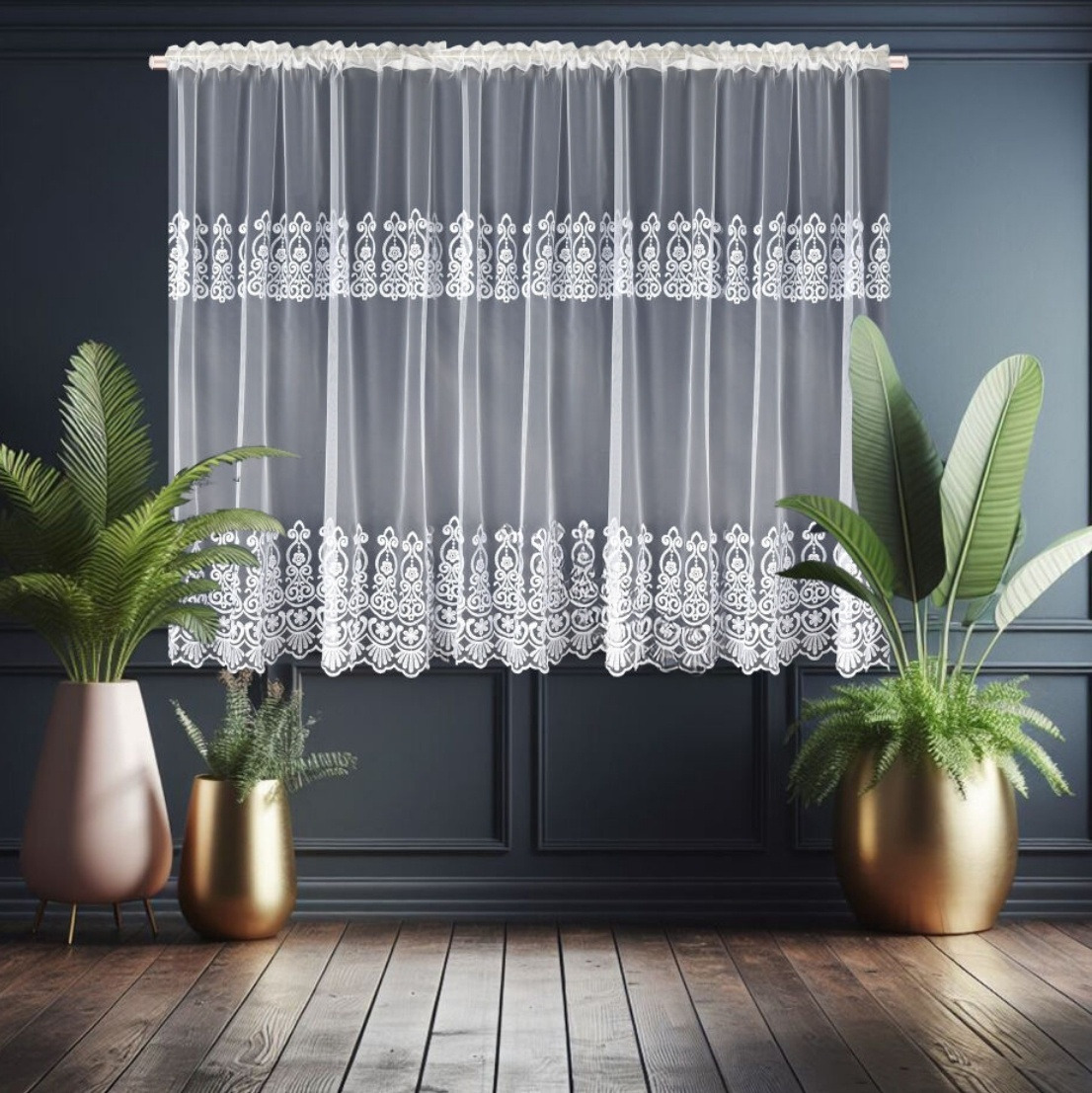 Kvalitní vzorovaná krátká hotová dekorační voálová záclona v rozměru 400x150 cm. Záclona má našitou řasící pásku s tunýlkem pro zavěšení na gárnyž, žabky nebo háčky. Krátká hotová dekorační záclona v moderním a trendovém provedení ideální do kuchyně nebo obývacího pokoje. 1 kus v balení.