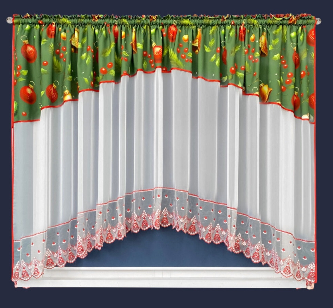 Kvalitní krátká vánoční dekorační záclona v kombinaci se závěsem v rozměru 400x160 cm, ideální do kuchyně nebo obývacího pokoje. Záclona má našitou řasící pásku s tunýlkem pro zavěšení na garnyž, žabky nebo háčky. 1 kus v balení. Vrchní část zdobí atraktivní vsadka se slavnostním vzorem. Spodní část závěsu zdobí krajka z markýzy.