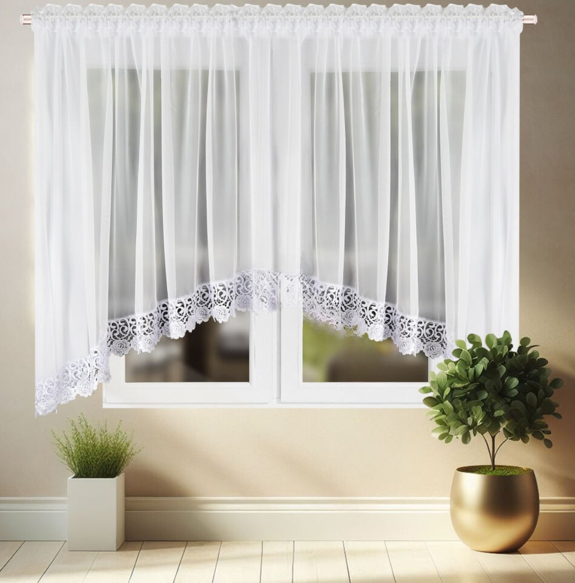 Kvalitní krátká hotová oblouková dekorační voálová záclona do ložnice nebo obývacího pokoje v rozměru 400x150 cm. Záclona má našitou řasící pásku s tunýlkem pro zavěšení na tenčí garnyž, žabky nebo háčky. Cena za 1 kus v balení. číst celé