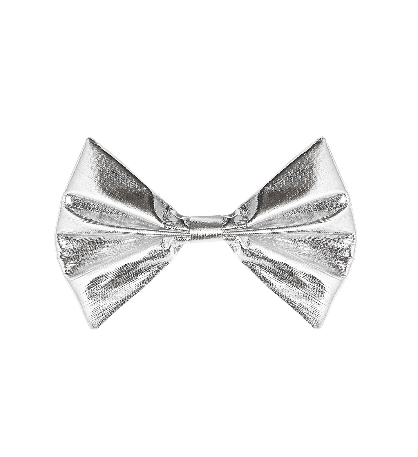 Motýlek ze stříbrné látky, snadno se nosí díky praktické gumičce, který obohatí váš převlek originálním a elegantním způsobem.