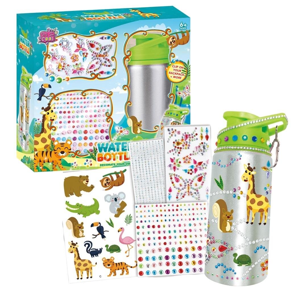 Zestaw zawiera butelkę na wodę, naklejki oraz różnokolorowe diamenciki. Dzieci mogą wybierać spośród różnych wzorów i układów, tworząc własne, unikalne dzieła sztuki.
