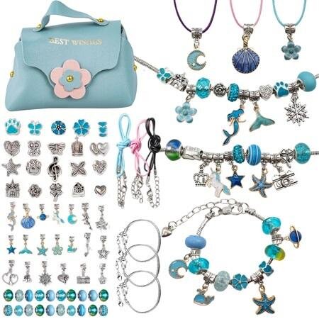 Podaruj swojemu dziecku niezapomniane chwile kreatywnej zabawy z zestawem do tworzenia naszyjników i bransoletek charms! Ten uroczy zestaw to idealny sposób na rozwijanie wyobraźni i zdolności manualnych, umożliwiając tworzenie unikalnych, osobistych ozdób. Zestaw zawiera różnorodne zawieszki, koraliki i charmsy, dominujące w pięknym niebieskim kolorze, co pozwala na tworzenie wspaniałych, harmonijnych kompozycji.