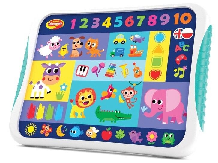 Dotykowy tablecik nauczy malucha pierwszych słówek i to od razu w dwóch językach! Zabawka wypowiada słowa z różnych grup tematycznych, a są wśród nich kolory, pojazdy, instrumenty muzyczne, figury, cyferki i zwierzątka. Aby usłyszeć wymowę danego słowa, wystarczy nacisnąć na odpowiedni obrazek. Poza funkcją zmiany języka, tablet posiada też tryb gry, w którym zadaniem dziecka będzie wskazać odpowiedni obrazek, do którego odnosi się wypowiadane słowo lub dźwięk. A po nauce, na najmłodszych czeka zabawa. W trybie piosenek, maluch usłyszy edukacyjne piosenki, a tryb melodie zabawi go wesołą muzyką