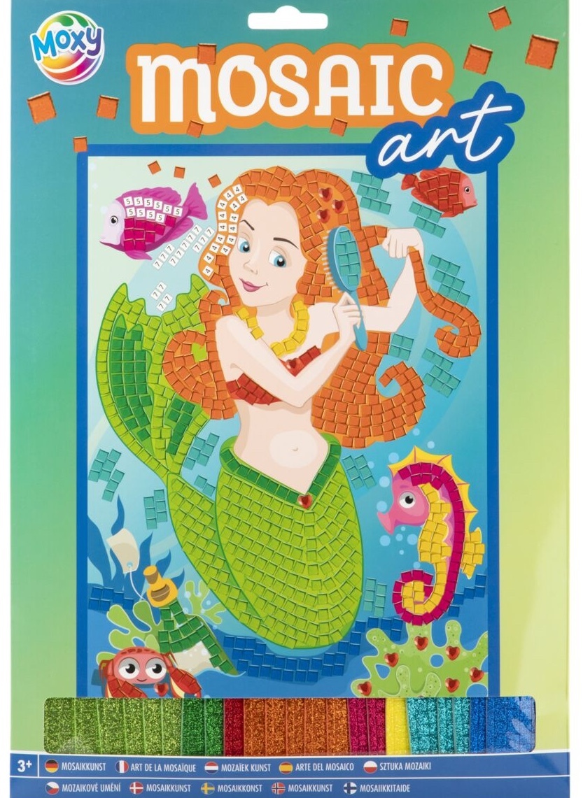 Tato sada obsahuje vše, co k tvorbě potřebujete: předtištěný obrázek mořské panny formátu A4, pěnové samolepky a třpytivé doplňky, které vaši mozaiku rozzáří a dodají jí jedinečný třpyt a živost. Díky jednoduchému a přehlednému provedení je tento kreativní set vhodný i pro nejmenší děti, které si tak díky němu procvičí nejen výtvarné dovednosti, ale i koordinaci očí a rukou.