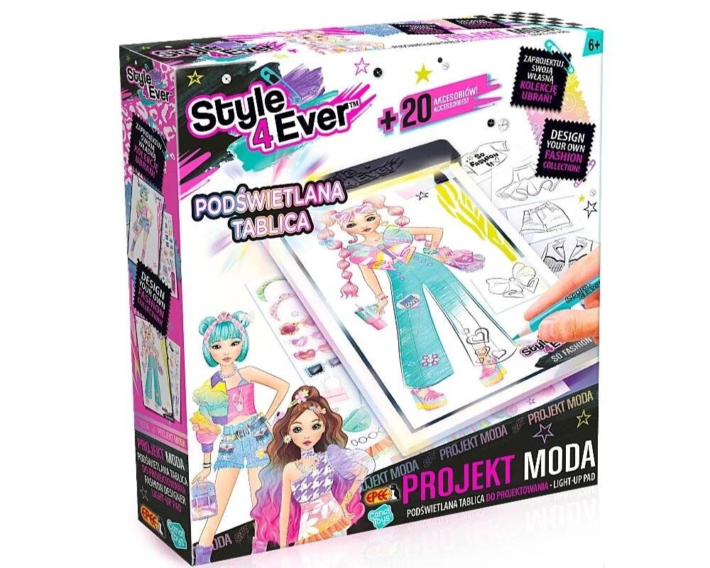 Zaprojektuj swoją własną kolekcję ubrań na specjalnie stworzonej w tym celu, podświetlanej tablicy. Umieść na niej szablony z wybranymi elementami garderoby oraz zarys modelki i zacznij odrysowywać. Dodawaj wzory i kolory według własnego pomysłu. Ozdabiaj naklejkami. To świetna zabawa, w której ogranicza Cię tylko wyobraźnia!