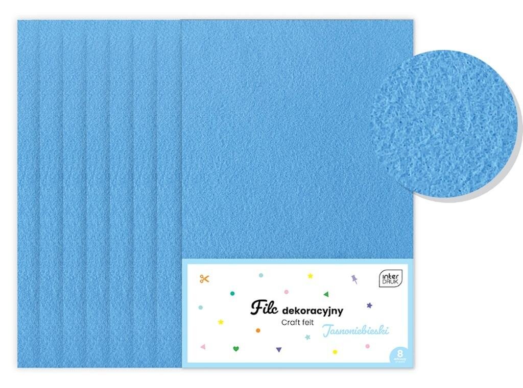 Idealny do szycia ozdób, maskotek, poduszek. Do kreatywnego wykorzystania w scrapbookingu. Opakowanie zawiera 8 arkuszy filców w rozmiarze A4 w jasnoniebieskim kolorze. číst celé