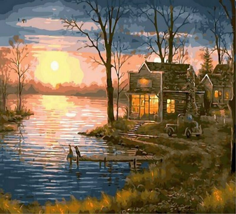 Malowanie po numerach Domek nad jeziorem zachód słońca 50x40cm 1008865