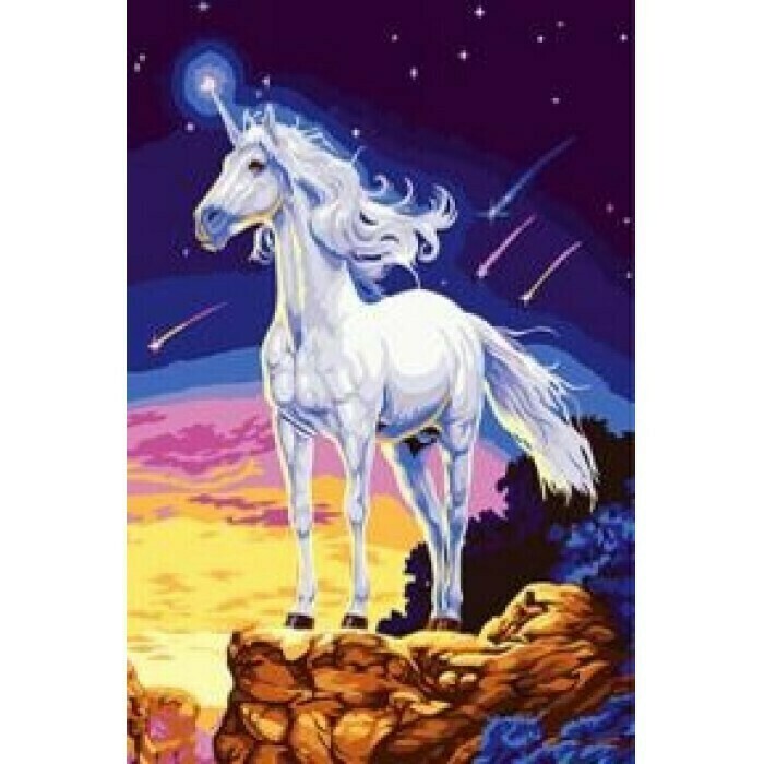 Jednorożec- zestaw do malowania po numerkach od firmy NORIMPEX. W opakowaniu znajdziemy płótno naciągnięte na drewnianą oprawę, trzy pędzle, 22 farby akrylowe o podobnych odcieniach i akcesoria do zawierzenia obrazu. Na płótnie znajduje się wzór podzielony na bardzo małe obszary, które są oznaczone cyferkami. Każdy numer odpowiada innemu kolorowi farby. Kolory farb również oznaczone są liczbami. Musimy dopasować numer na płótnie do numeru na farbie i wypełnić obszar danym kolorem przy użyciu pędzelków. Tak stworzony obraz możemy zawiesić na ścianie przy użyciu dostępnych akcesoriów. Grafika nie jest widoczna od razu. Tworzy ją dopiero układ kolorów, które naniesiemy na płótno. Zwiększa to satysfakcję z malowania, ponieważ obraz wyłania się dopiero z czasem. Instrukcja znajduje się z tyłu pudełka. Znajdziemy tam informacje dotyczące różnych technik malowania. Zestaw nadaje się również dla dorosłych, ponieważ po skończeniu dzieła można uzupełnić je o dodatkowe detale.Trudność: 5/5Rozmiar obrazu: 40x50cmWymiary opakowania: 51x2,5x41cmSugerowany wiek: 7+