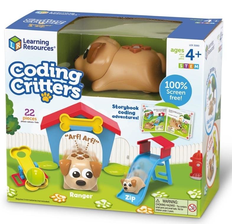 Coding Critters Ranger ,Zip, Robot do nauki programowania dla dzieci, Piesek. Poznaj Coding Critters, kolekcję zabawek które są niesamowitymi pomocnikami w nauce programowania. Te urocze zwierzaki są jednymi z najlepszych robotów do poznawania tajników programowania, wielokrotnie nagradzanymi na świecie. Ranger oraz Zip to psiaki, które w przystępny i zabawny sposób wprowadzają dzieci w świat programowania w 100% bez ekranu. Uczą najmłodszych krytycznego myślenia, samodzielnego rozwiązywania problemów oraz stanowią doskonały wstęp do nauk ścisłych, technologi, inżynierii i matematyki. Do zestawu dołączona jest książeczka zawierająca zabawne przygody dzielnego psa Rangera i psotnego Zipa. Dzieci, poprzez zabawę ze swoimi zwierzakami tworzą pierwsze programy. Podejmij wyzwanie i sprawdź, czy potrafisz zaprogramować Rangera tak, by bawił się w chowanego, aportował lub złapał Zipa, gdy zjedzie ze zjeżdżalni. Oprócz podążania za wyzwaniami zawartymi w książce, dzieci mogą samodzielnie tworzyć własne programy. Ranger nie tylko wykonuje proste polecenia, ale może stać się również wyjątkowym, uroczym zwierzątkiem domowym. Wystarczy nacisnąć jego nosek, aby aktywować Tryb Zabawy. Teraz można go nakarmić, pogłaskać lub położyć spać. Można nawet sprawić, że zatańczy i zaśpiewa zabawne piosenki! Wprowadza podstawy programowania dla najmłodszych. 100% bez ekranu. Zestaw obejmuje 22 elementy. Dzieci uczą się programowania dzięki dołączonej, 16-stronicowej, kolorowej książeczce. Tworzenie sekwencji ułatwia 10 odcisków psich łapek. 3 kartonowe dekoracje pozwalają zbudować wyjątkową scenografię. Piłka, wyrzutnia, domek oraz zjeżdżalnia sprawią, że pokój stanie się niesamowitym placem zabaw. Możliwość wprowadzenia sekwencji do 30 kroków. Jeden krok to około 10 cm. Dołączona instrukcja w języku polskim. Wymaga 3 baterii AAA (baterie nie są dołączone do zestawu).