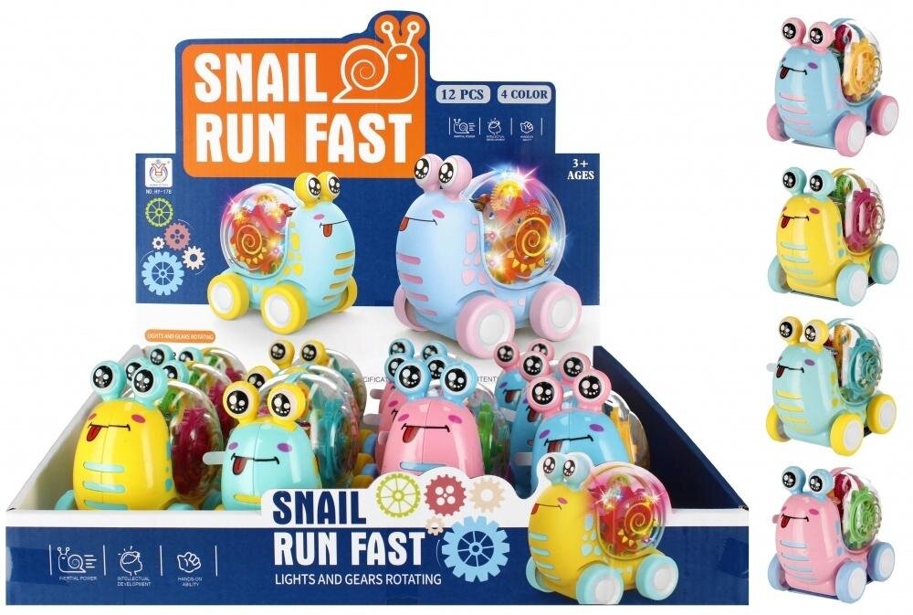 Zabawka posiada napęd- po naciągnięciu ślimak jedzie do przodu, posiada efekty świetlne. Fajna propozycja dla malucha lubiącego wesołą zabawę.