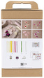 Zawartość: 6 rolek krepiny w różnych kolorach, drut powlekany papierem w 2 grubościach, gąbeczka z tuszem (do pręcików i krawędzi płatków), gąbkowy aplikator, samozastygająca masa plastyczna 250 g , klej Multi Glue oraz szablony do 4 rodzajów kwiatów i liści.