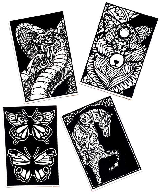 Specjalny papier sprawia że kolory są bardziej intensywne. Można kolorować flamastrami, kredkami, temperami, wszystkim co pisze po papierze. Można stworzyć rewelacyjne efekty za pomocą cieniowania.