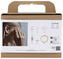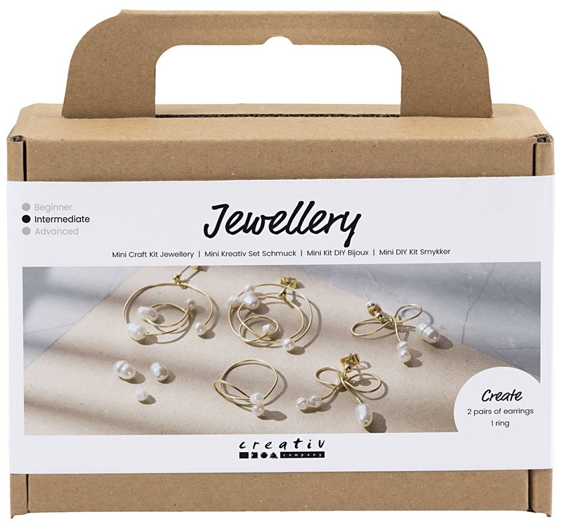 Zawartość: koraliki imitujące perły w 3 rozmiarach, 1,5 m sztywnego drutu jubilerskiego, 4 sztyfty z kulką, klej uniwersalny, instrukcja obrazkowa krok po kroku oraz szablon.