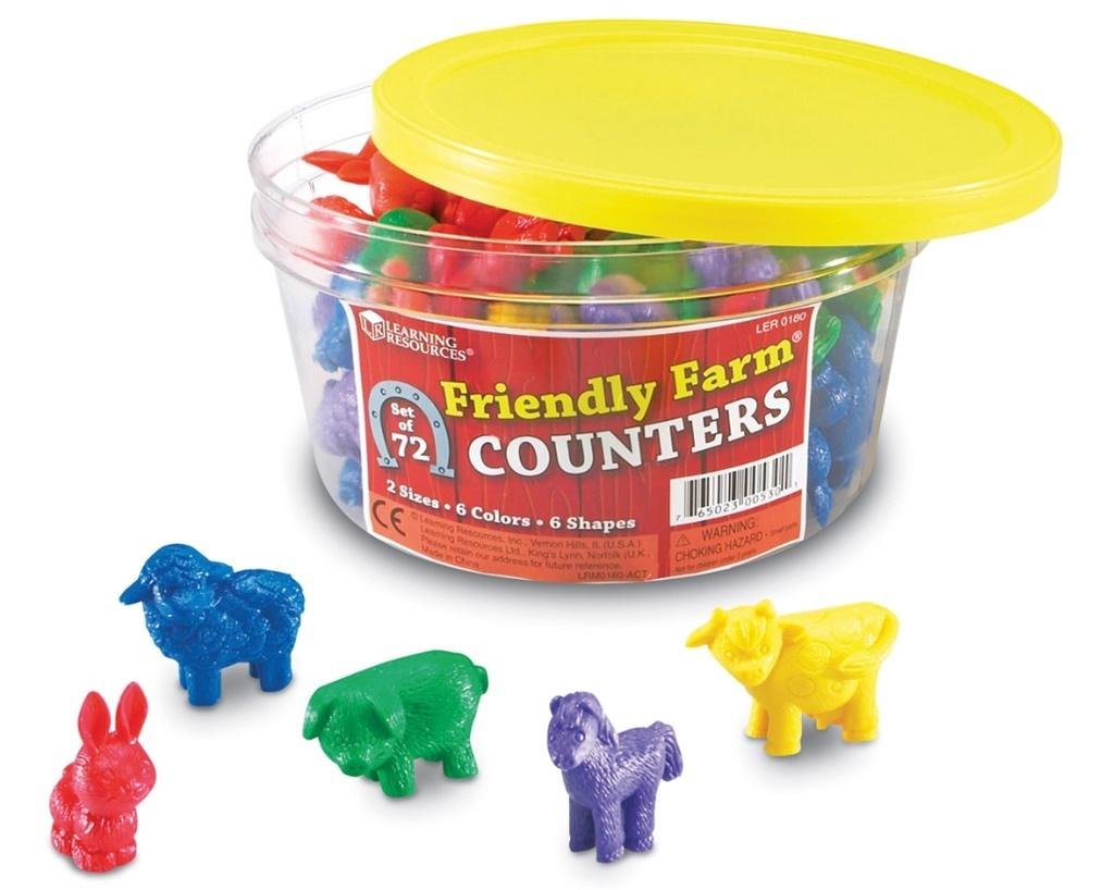 Farma, Figurki do nauki liczenia, Zestaw 72szt. Nauka przez zabawę! Learning Resources(R) to producent bezpiecznych, edukacyjnych i innowacyjnych zabawek, którym zaufali rodzice i nauczyciele na całym świecie. Baw i Ucz się! Doskonały zestaw wprowadzający do nauczania dzieci o zwierzętach na farmie. Zabawa w liczenie, sortowanie, rozpoznawanie i porównywanie, może być inspirująca. Zestaw edukacyjny do nauki liczenia i rozpoznawania zwierząt hodowlanych. Kolorowi przyjaciele z podwórka zamieniają czynności związane z nauką liczenia, grupowania, klasyfikowania i sortowania w fantastyczną przygodę. Zawiera 72 zwierzęta: Konika, świnkę, kaczuszkę, krówkę, owieczkę, królika. Każdy rodzaj po 6 szt. w 2 rozmiarach. Zestaw wykonany z przyjaznego w dotyku, odpornego na pleśń tworzywa. Cały zestaw mieści się w solidnym plastikowym pudełku.