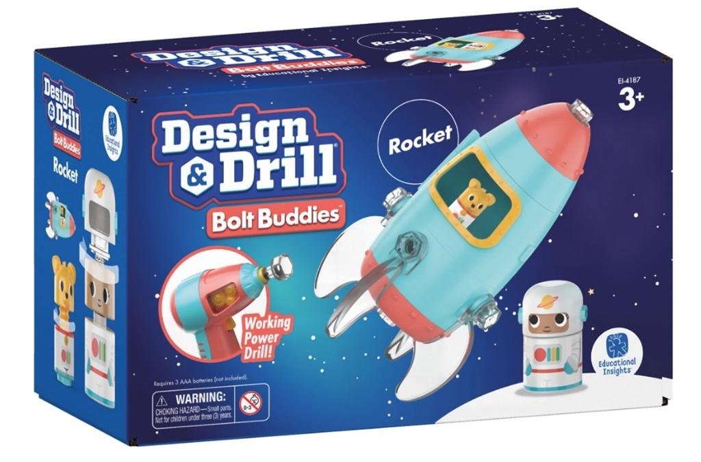 Design & Drill(R) Stacja kosmiczna, Rakieta do złożenia, Wkrętarka dla dzieci, Zestaw edukacyjny. Nauka przez zabawę! Od ponad 50 lat Educational Insights(R) pomaga dzieciom uczyć się poprzez zabawę. Firma jest dumna ze współpracy z ekspertami z wielu różnych dziedzin, od naukowców przez nauczycieli po artystów i zapewnia, że ich produkty są bezpieczne i najwyższej jakości. Zabawka idealna dla dzieci, które lubią uczyć się o kosmosie i rakietach oraz uwielbiają konstruować i budować! Użyj wkrętarki, aby zbudować rakietę z kolekcji Design & Drill(R) Bolt Buddies , umieść astronautę Buddiego oraz jego drugiego pilota, szczeniaczka Space Dog Buddy Rover w kokpicie. Gotowi? Start! Zaczęła się międzygalaktyczna kosmiczna przygoda! Zestaw zawiera przyjazną dzieciom zabawkową wkrętarkę, rakietę z 6 częściami, 7 śrubami i dwie figurki Bolt Buddy: Buddiego ze zmiennym wyrazem twarzy oraz szczeniaczka Space Dog Buddy Rover. Maluchy uczą się podstaw prostej budowy i inżynierii, jednocześnie rozwijając umiejętności motoryczne przy pomocy narzędzi zaprojektowanych specjalnie dla małych rączek. Zabawka wspiera rozwój wyobraźni przestrzennej, uczy projektowania oraz logicznego myślenia. Czynności takie jak składanie, skręcanie doskonalą zdolności manualne oraz zręcznościowe dziecka, uczą precyzji, a także wspierają koordynację wzrokowo- ruchową. Ekologiczne opakowanie, przyjazne dla środowiska! Nie wyrzucaj pudełka, to część gry! ( Stacja Kosmiczna ) Pakiety Bolt Buddies stają się zabawnymi zestawami do zabawy, co stanowi krok w kierunku zrównoważonego rozwoju. Świetna aktywność dla dzieci, która pozwala bawić się i uczyć poza klasą, podczas pobytu w domu. Wkrętarka posiada dwa tryby pracy, wkręcania lub wykręcania śrub - tak jak w prawdziwym urządzeniu. Wkrętarka wyposażona w okno "a kuku" przez które, dzieci widzą, jak koła zębate obracają się. Wkrętarka wymaga 3 baterii AAA (brak w zestawie). OSTRZEŻENIE: NIEBEZPIECZEŃSTWO ZADŁAWIENIA - Małe części.