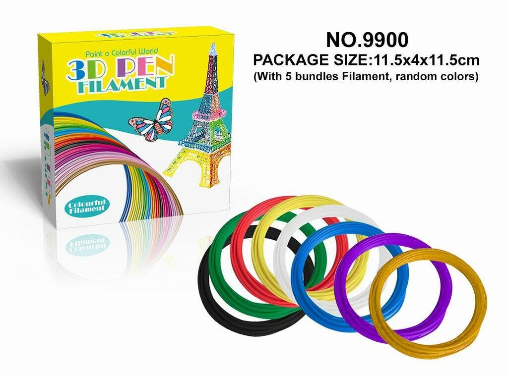 Zestaw pięciu specjalnych filamentów o grubości 1,75 mm do długopisów 3D. Filament jest rozgrzewany wewnątrz długopisu 3D i wychodzi z jego dyszy w formie plastycznej, zastygając po wysunięciu. Charakteryzuje się on dużą wytrzymałością.Cechy produktu:- Średnica filamentu: 1,75mm.- Temperatura druku: 70-120°C.- Pasuje do większości długopisów 3D.Zawartość:- 5 sztuk filamentów w losowych kolorach.Wymiary opakowania: 11x11x4cmWiek: 6+