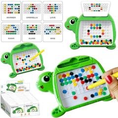Przedstawiamy uroczą, edukacyjną zabawkę dla najmłodszych - magnetyczną tablicę w kształcie żółwia! To idealny sposób na rozwijanie kreatywności i zdolności manualnych u dzieci, łącząc zabawę z nauką. Główne cechy produktu: Magnetyczna konstrukcja: Zabawka działa na zasadzie magnesów - pod szklaną osłoną znajdują się kolorowe kuleczki, które można przesuwać za pomocą dołączonego rysika z magnetyczną końcówką. Kreatywna zabawa: Dziecko może tworzyć własne, kolorowe wzory i obrazki, co stymuluje wyobraźnię i zdolności artystyczne. Edukacja: W zestawie znajdują się karty z przykładowymi wzorami (np. cyfry, parasol, rower), które pomagają w nauce rozpoznawania kształtów i kolorów. To doskonałe wprowadzenie do świata liczenia i rysowania. Bezpieczeństwo: Zabawka jest w pełni bezpieczna dla dzieci - kuleczki są szczelnie zamknięte wewnątrz obudowy, więc nie ma ryzyka ich połknięcia. Wygodna forma: Kompaktowy rozmiar i lekka konstrukcja sprawiają, że zabawka jest idealna do zabawy w domu, w podróży czy w samochodzie. Trwałość: Wysokiej jakości materiały gwarantują długotrwałą zabawę. Uroczy design: Kształt uśmiechniętego żółwika w zielonym kolorze z pewnością przyciągnie uwagę każdego malucha. Wielkość opakowania: 16x13x2 cm Korzyści dla rozwoju dziecka: Rozwój motoryki małej: Przesuwanie kuleczek za pomocą rysika wzmacnia chwyt i precyzję ruchów rączek. Rozwój koordynacji wzrokowo-ruchowej: Dziecko musi precyzyjnie celować rysikiem, aby przesunąć kuleczkę w wybrane miejsce. Nauka kolorów i kształtów: Tworzenie wzorów z kolorowych kulek pomaga w nauce i utrwalaniu wiedzy. Stymulowanie koncentracji: Zabawa wymaga skupienia i cierpliwości, co pozytywnie wpływa na zdolność koncentracji. Ta magnetyczna tablica to fantastyczny, edukacyjny prezent, który zapewni dziecku wiele godzin kreatywnej i wartościowej zabawy!