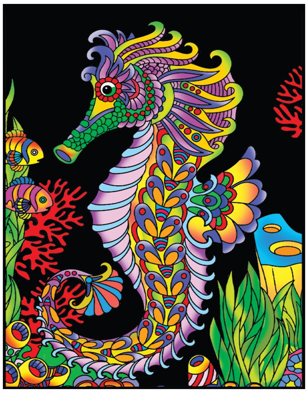 Wypukłe linie ułatwiają nie wychodzenie za linie, a na głębokiej matowej czerni nie widać drobnych potknięć przy kolorowaniu. Welwet nałożony jest na papier przyklejony do sztywnej tektury, dzięki czemu obraz nie wymaga ramki jeśli zdecydujemy się go powiesić na ścianie.