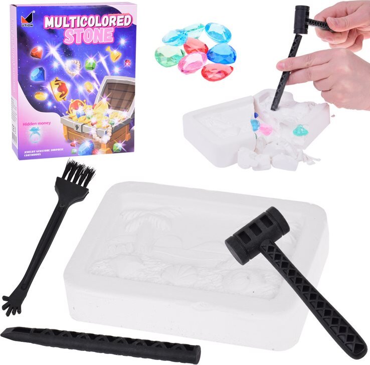 Inspirující hračka pro všechny děti, které sní o povolání archeologa nebo hledače pokladů. Úkolem je pomocí přiloženého nářadí objevit drahé kameny ukryté v sádrovém odlitku. Hra je náročnější, ale odměnou je radost z nalezeného „pokladu“.