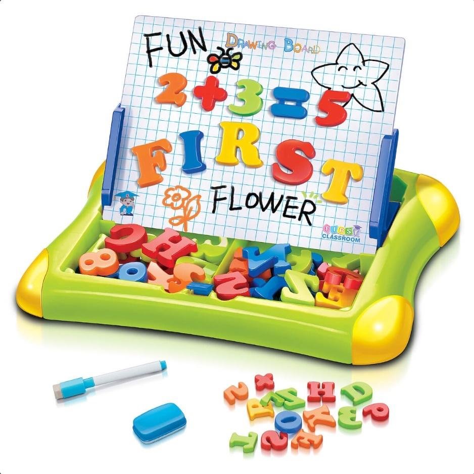 Dziecko może układać je na tablicy, tworząc w ten sposób pierwsze słowa i uczyć się prostych działań matematycznych. Na tablicy można również rysować i pisać dołączonym do zestawu pisakiem, a po skończonej zabawie zetrzeć wszystko gąbeczką i rozpocząć wszystko od nowa.