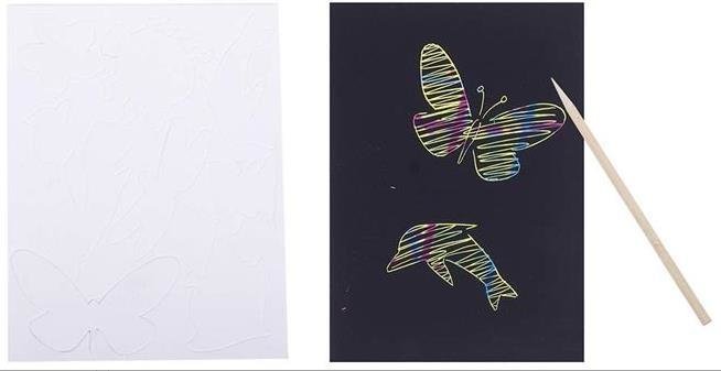 Zabawa polega na zdrapaniu wierzchniej czarnej warstwy, aby powstał ciekawy obrazek. Pod czarną warstwą podkładka ma kolorowe, tęczowe tło. Rezultat pracy nie jest do końca znany, gdyż zależy od ułożenia kolorów ukrytych pod czarną warstwą.