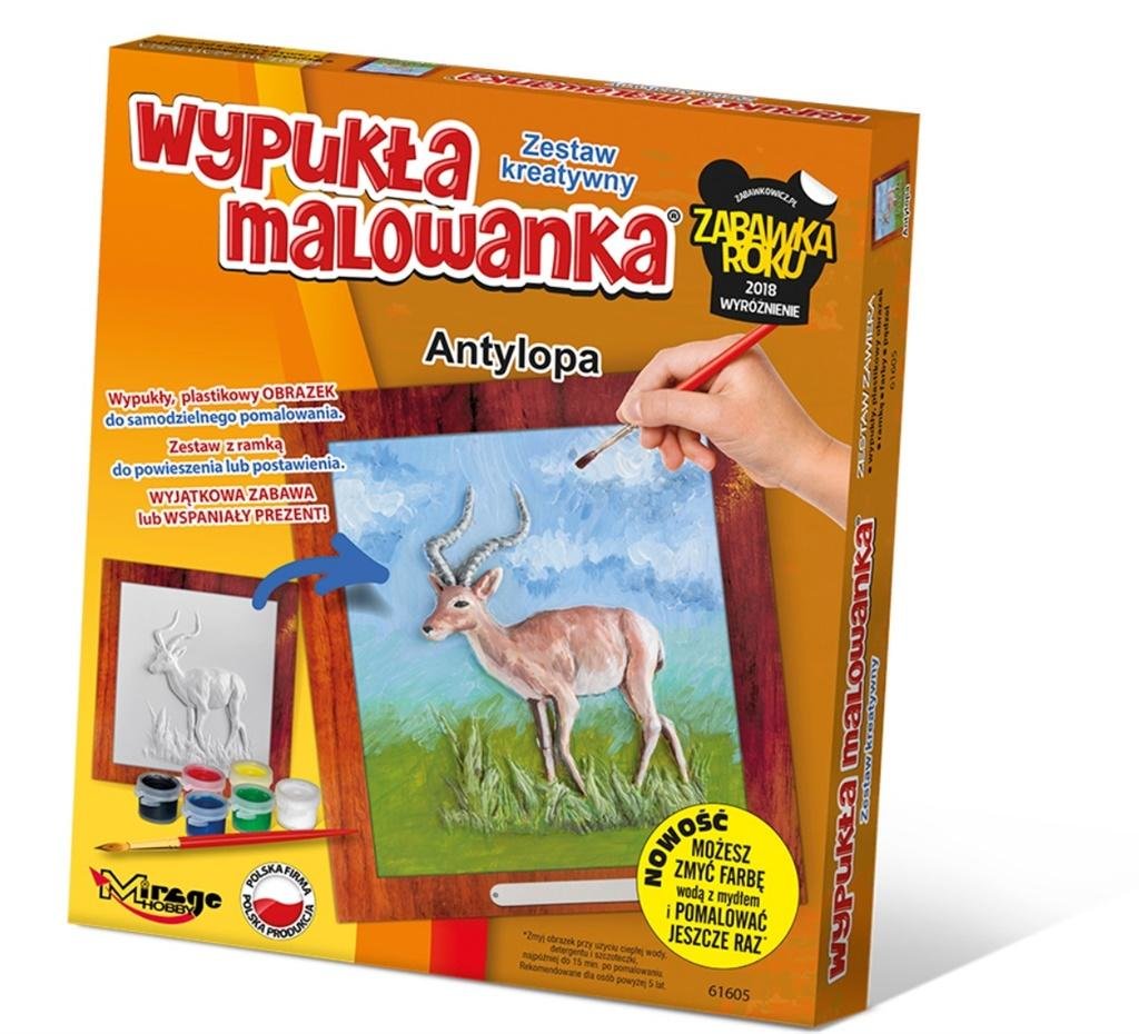 Wypukła Malowanka od Mirage Hobby to Zestaw Kreatywny dla osób powyżej 5. roku życia. Zestaw zawiera wypukły, plastikowy, kształtny obrazek, farbki akrylowe, pędzelek oraz ramkę z kartonu do postawienia lub powieszenia. Zmyj obrazek przy użyciu ciepłej wody, mydła i szczoteczki, najpóźniej do 15 min. po pomalowaniu. Obrazek ma odpowiedni do wzoru wypukły kształt, który jest dobrze odczuwalny w dotyku. Produkt jest wymyślony i wyprodukowany w Polsce! Wszelkie prawa zastrzeżone. Każda Wypukła Malowanka to konkretny wzór z danej serii. Kolekcja jest podzielona na różne serie np. Koty, Psy, Konie, Futrzaki, Dinozaury, Jednorożce, Kwiaty, Sport, Bajki, Zoo i inne. Seria Wypukła Malowanka Zestaw Kreatywny została nagrodzona Wyróżnieniem Zabawka Roku 2018.
