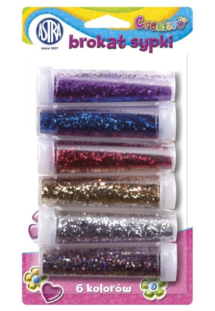 Brokat przeznaczony jest do dekoracji prac plastycznych, ozdób świątecznych, papieru, scrapbookingu. Można nim również dekorować przedmioty wykonane z gliny, masy solnej itp. Pojemniki posiadają otwory ułatwiające dozowanie brokatu. Mix 6 kolorów.