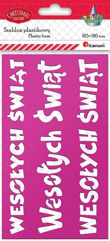 Szablon wykonany z cienkiego, elastycznego tworzywa. Może być stosowany wielokrotnie. Łatwo go dopasować do różnych powierzchni. Szablon mocujemy taśmą samoprzylepną lub klejem w sprayu. Malujemy pędzlem lub gąbką. Po użyciu szablon myjemy wodą z mydłem lub płynem do mycia naczyń. Szablon ma wielokrotne zastosowanie m.in. do: decoupage, scrapbooking, do ozdabiania ścian, mebli, tkanin oraz kartek okolicznościowych. Wymiary: 105 x 180 mm. Wzór: napisy "Wesołych Świąt".