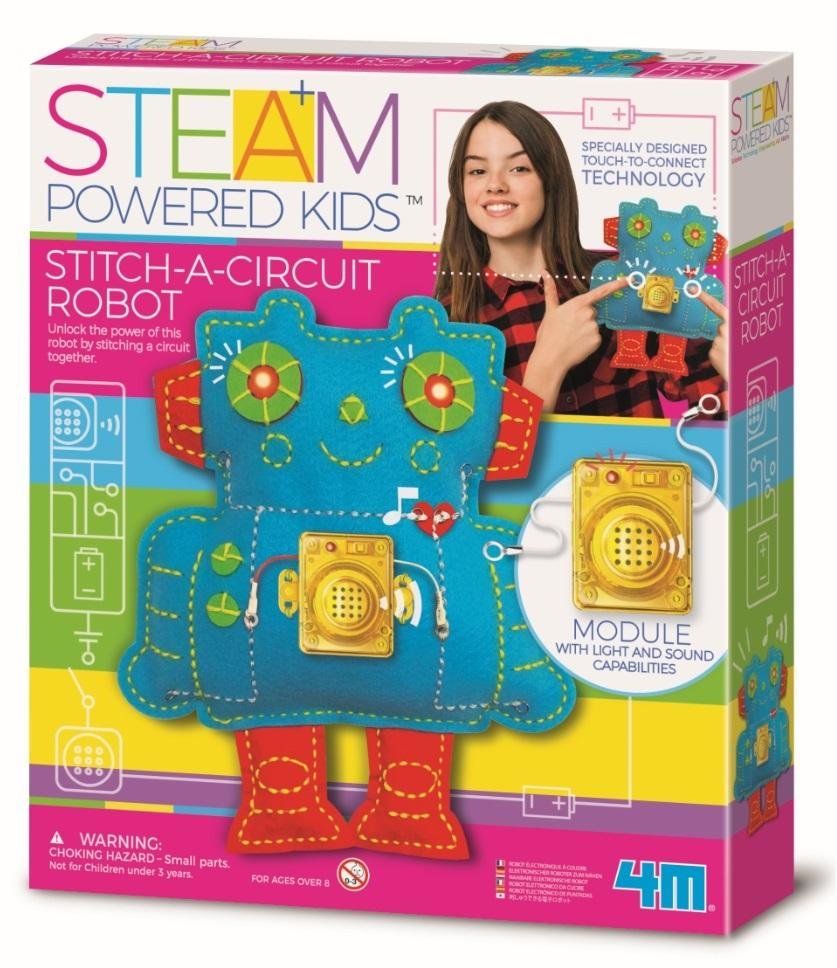 Zrób działający obwód elektryczny zszywając ze sobą elementy robota! Seria Steam powstała specjalnie, by zainteresować nauką te dziewczynki, którym nie odpowiada surowy design klasycznych zabawek konstrukcyjnych. Zestaw zawiera: wstępnie wycięte kształty filcowe, 1 moduł dźwiękowy i diodowy z 2 plastikami podstawy (w zestawie 2 baterie guzikowe 1,5 V AG13 / LR44), 1 szpula przewodząca nici, 2 szpulki nici do haftu, 2 igły plastikowe, 6 metalowych kółeczek, farsz i szczegółowa instrukcja w zestawie. Aby uzyskać instrukcje w innych językach, zeskanuj QR zawiera kod. Wymagane również: nożyczki i taśma. Podczas używania nożyczek wymagany jest nadzór osoby dorosłej. Wiek: 8+