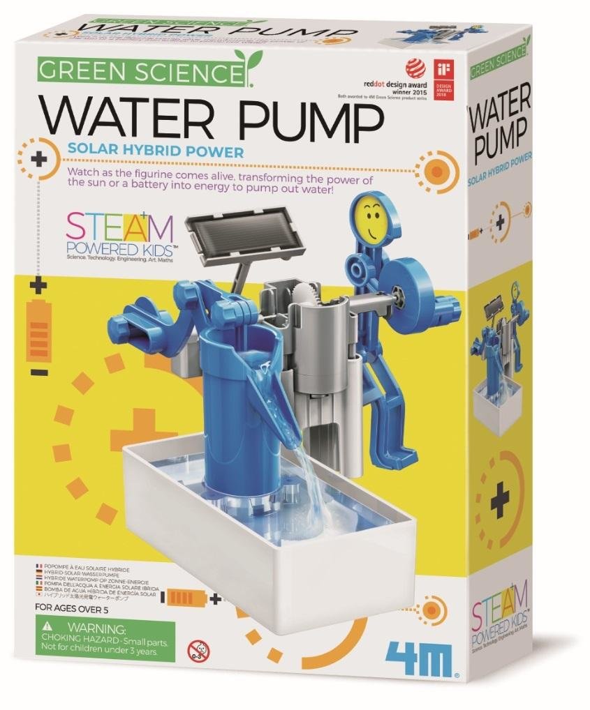 Ta mechaniczna pompa wodna pompuje wodę dzięki energii słonecznej, gdy padają na nią promienie Słońca. Może być również zasilana baterią, gdy nie ma światła słonecznego. Zestaw pokaże dziecku jak działają panele słoneczne i zasilanie hybrydowe. Samodzielne zbudowanie modelu sprawi, że dziecko nie tylko zobaczy, ale i zrozumie mechanizm działania pompy. Wiek: 8+