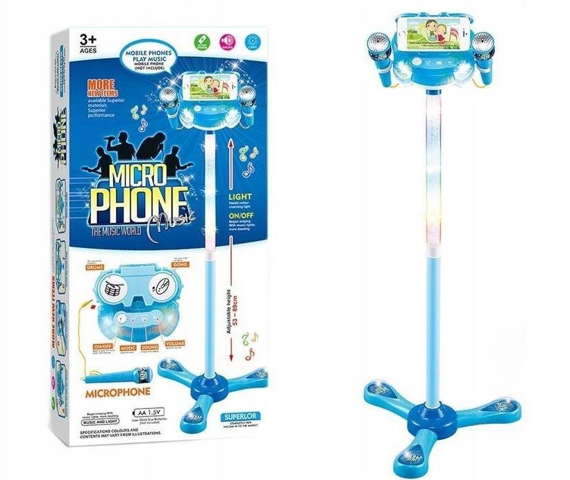 Zestaw dla dzieci do karaoke.Podwójny duży mikrofon na stojaku.Funkcja mp3 ze stojakiem na telefon.Świecące światełka led. číst celé